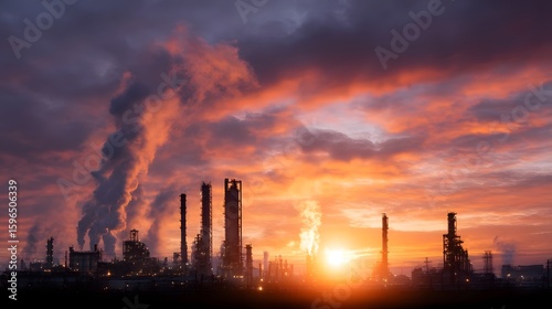 refinery, sunrise, industrial, landscape, industry, factory, oil, gas, smoke, sunset, sky, cloud, dramatic, environment, energy, infrastructure, pollution, chimney, tower, technology, urban, city landscape, power, heat, hazy, orange, red, blue, grey, steel, metal, pipe, structure, process, emission, production, transport, resource, fossil, fuel, capital, economy, commerce, manufacturing, engineering, extraction
