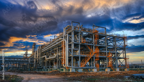 Industrial refinery plant with complex piping and structures at dramatic sunset