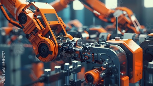 Industrial Robot Arm: A powerful industrial robot arm assembling car parts in an automated factory.