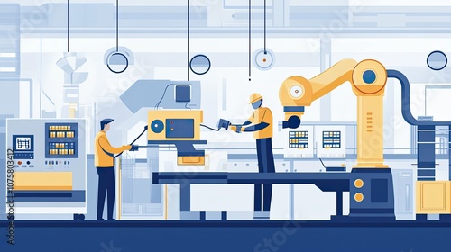 robot, arm, industrial, factory, men at work, machinery, automation, manufacturing, technology, production, line, conveyer, belt, equipment, system, workplace, task, operation, process, safety, control, panel, machine, operator, engineer, metal, part, assembly, quality, inspection, innovation, future, progress, efficiency, modern, design, collaboration, human, interaction, blue, yellow, white, grey, background, illustration, graphic