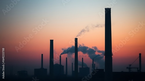 Industrial silhouettes at dusk contrast against a colorful sky, shrouded in atmospheric haze.