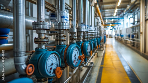Industrial water control cabinet with multiple gauges and pipes, showcasing well organized system in large facility. scene reflects efficiency and precision in water management