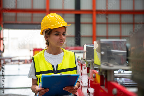 Industrial woman engineer wear uniform and helmet using laptop are checking system machine at factory. Workers industrial factory. Machine maintenance technician operation concept.