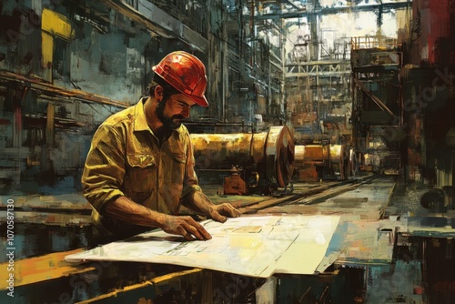 Industrial Worker Analyzing Blueprint in Modern Setting