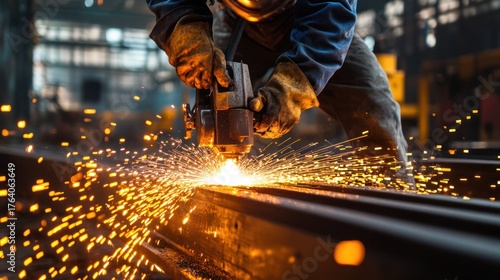 industry, men at work, grinding, metal, spark, factory, manufacturing, labor, construction, welding, cutting, machinery, equipment, tool, safety, glove, helmet, blue-collar, industrial, production, workshop, craft, skilled, profession, occupation, energy, heat, fire, bright, orange, yellow, dark, background, closeup, detail, action, motion, power, strength, hard work, dedication, precision, engineering, metallurgy, fabrication
