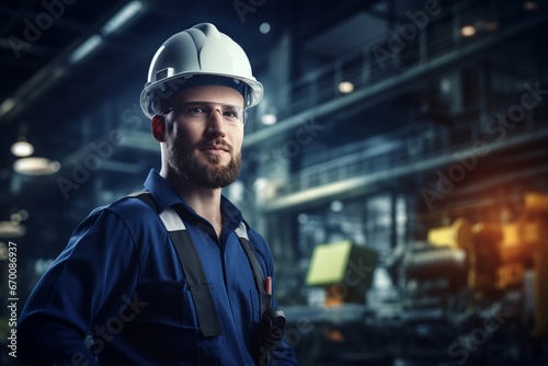 Industrial Worker in Hard Hat and Overalls in Factory Setting
