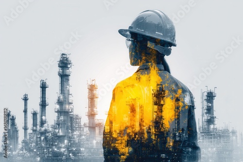 Industrial worker in hard hat gazing at a refinery skyline during sunset, symbolizing progress