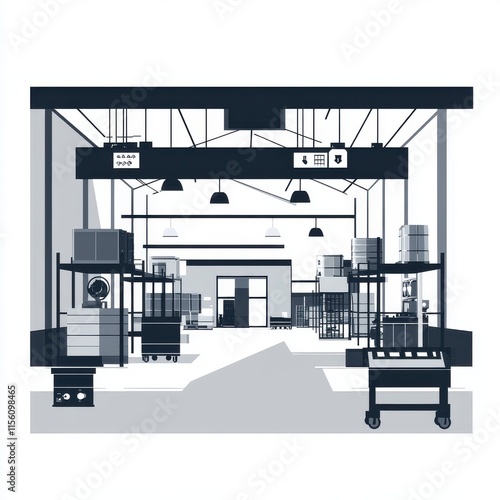 Industrial workspace with large shelving units and equipment in a monochromatic setting.