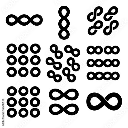 Infinity Pattern Icons. Solid style icons of repeating infinity patterns: horizontal line of infinity symbols, vertical stacked