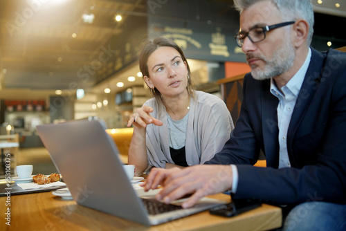 meeting, salesman, manager, businesswoman, business meeting, working, businessman, sale, informal, relaxed, man, woman, professional, job, career, merchandising, computer, workplace, cafeteria, modern, office space, 30s, 40s, grey hair, caucasian, people