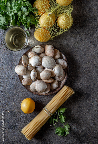 Ingredients for preparation spaghetti with clams - raw fresh clams, spaghetti coriander, white wine lemon