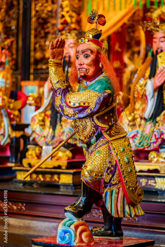 Inside Bangka Qingshan Temple in Taipei, Taiwan, the main altar also features a statue of Nantian Dashengye, a revered deity known for his power and protection. The statue is dressed in a vibrant robe