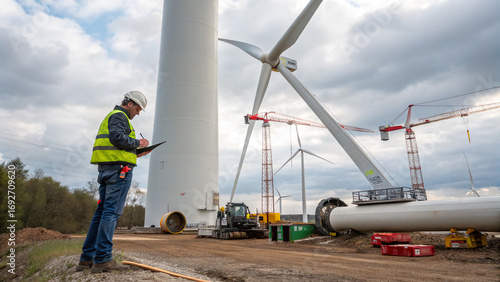 wind turbine, construction, inspection, men at work, hard hat, crane, equipment, rural area, renewable energy, installation, environment, sustainability, technology, engineering, infrastructure, project, machinery, development, site, productivity, energy, landscape, horizon, cloud, power, resource, industrial, green energy, manpower, safety, progress, planning, teamwork, energy efficiency, climate, labor, innovation, clean energy