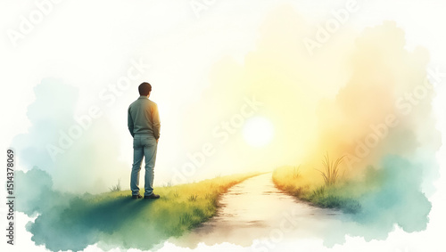 Inspirational Imagery of Individual Contemplating Career Possibilities Outdoors at Symbolic Crossroads - Photo Stock Concept with Empty Space for Text on Left Side