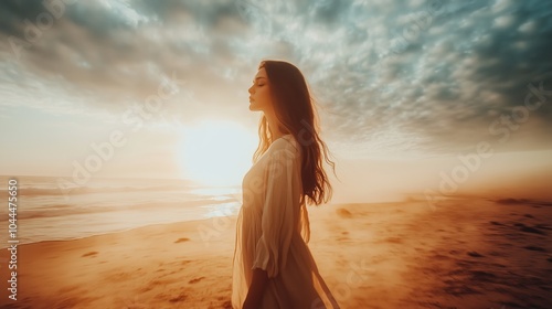woman, beach, sunset, serene, peaceful, horizon, wave, sandy shore, tranquil, calm, natural beauty, relaxing, summer evening, golden hour, beach vacation, seaview, tropical beach, barefoot beach, warm colors, meditative, scenic beauty, oceanfront, solitude, relaxation, tropical paradise