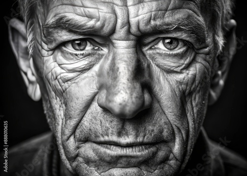 Intense close-up of a mature male face in high-contrast black and white, showcasing expressive wrinkles, strong facial structure, and deep-set eyes.