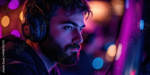 Intense gaming session of a focused player in a vibrant e-sports arena at night