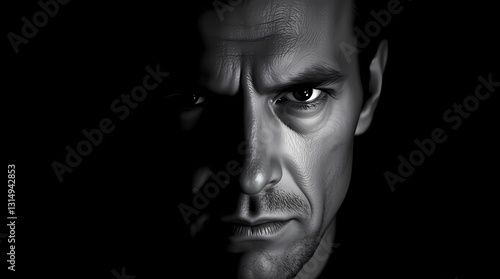 Intense Gaze: Dramatic black and white portrait of a man with a stern expression, his face partially shadowed, creating an atmosphere of intensity and intrigue.