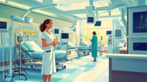 Intensive therapy clinic. Patients hospital care in ward interior. Woman mechanical ventilation apparatus, doctors nurse vector illustration illustration
