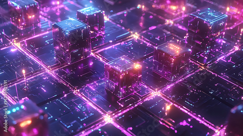 Interconnected glowing cubes on a grid, illuminated by pink and blue lights, suggesting a digital network.