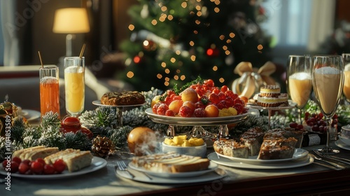 festive, holiday, seasonal, breakfast, food, cookery, festivity, christmas, celebration, joyful, delicious, decadent, buffet, platter, table setting, feast, croissant, pastry, muffin, juice, fresh fruit, egg, bacon, waffle, jam, selection, variety, colours, bright, ornate, decorated, traditional, cultural, international, deliciously, tasty, treat, cheerful, decoration, ornament, napkin, cutlery, plate, goggles, toast