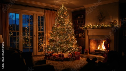 Interior Christmas scene featuring a glowing tree, fireplace, and gifts, evoking a cozy atmosphere during the holiday season