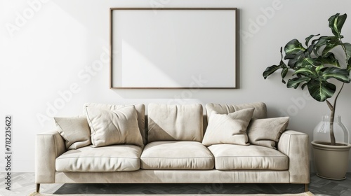 interior design of modern living room with beige fabric sofa and cushions. White wall with frame and space for text, living, furniture