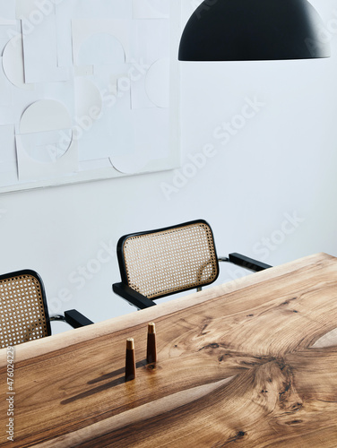 Interior design of stylish dining room interior with family wooden table, modern chairs, plate with nuts, salt and pepper shakers. Concrete floor. White wall. Template.