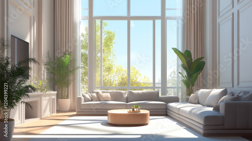 "Interior of a bright living room featuring cozy grey sofas positioned near a large window, creating an inviting and airy atmosphere."