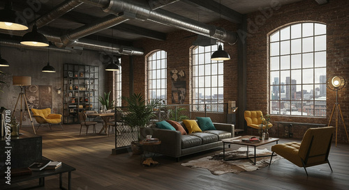 Interior of a modern industrial-style living room with brick walls, large windows, and cozy furniture.