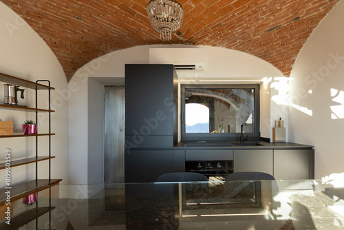 interior, indoor, indoor, inside, kitchen, house, home, apartment, flat, architecture, black, table, glasses, chair, angle, no people, furniture, old, detail, closeup, white, wall, nobody, window, fruit, orange, elegant, shadow, day, residence, sink, oven, modern, ceiling, brick, red, room, design, contemporary, new