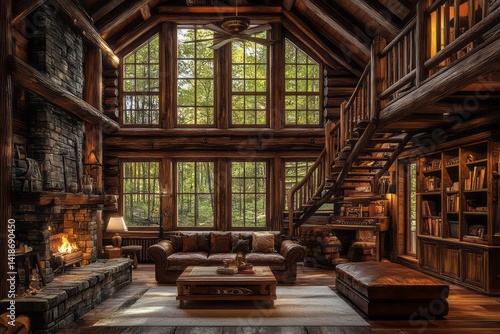 cabin, log, interior, rustic, wood, fireplace, stone, window, sofa, table, book, staircase, room, cosy, home, architecture, design, armchair, ottoman, lamp, bookshelf, furniture, nature, light, tree, forest, autumn, view, warm, comfortable, retreat, relaxing, peaceful, quiet, country, house, building, decor, style, luxurious, elegant, family, vacation, get-away, dwelling, residence, filed