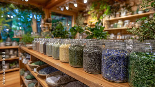 Interior of a zero-waste store with neatly arranged rows of glass jars filled with grains, lentils, spices, and herbs on wooden shelves, surrounded by soft natural light and warm e