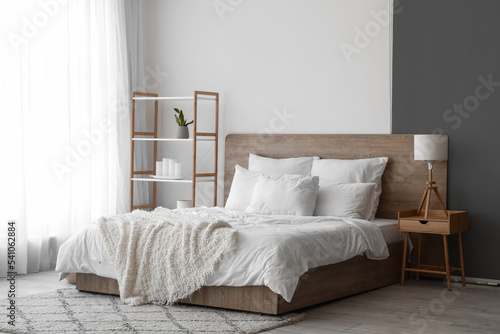Interior of modern bedroom with big bed and shelving unit