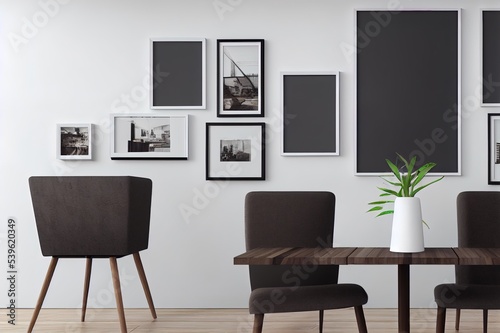 Interior of modern dining room with white walls, wooden floor, long table and two vertical mock up poster frames. 3d rendering