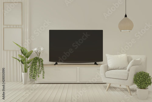 Interior poster smart tv cabinet and arm chair on room minimal design .3D rendering.