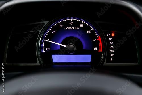 Interior view of car with black salon. Modern luxury prestige car interior: speedometer, dashboard and tachometer with white backlight and other buttons. Soft focus