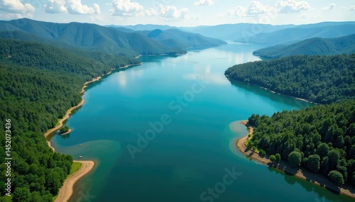 Interlocking lines of shoreline create geometric lake shape from above, drone, overview, land