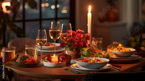 “Intimate Candlelit Dinner for Two with White Wine and Red Roses - Romantic Evening Meal Setting with Gourmet Cuisine”