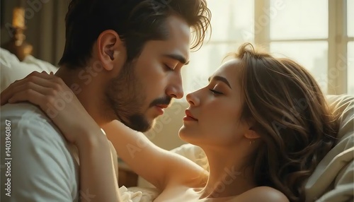 couple, embracing, lying, bed, bedchamber, indoor, man, woman, cuddle, hugging, togetherness, intimacy, love, romance, affection, relaxation, serene, peaceful, morning, daylight, human relationships, trust, close, tenderness, affectionate, connection, romantic, lover, lifestyle, content, partner, home, married, sharing, bonding, harmony, sleep, window, resting