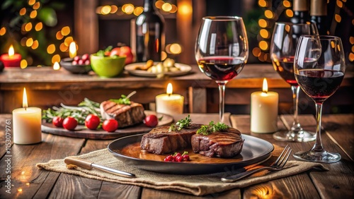 Intimate dinner for two with steaks and red wine on a luxurious table, romantic dinner for two steaks red wine candlelight, romantic evening at home