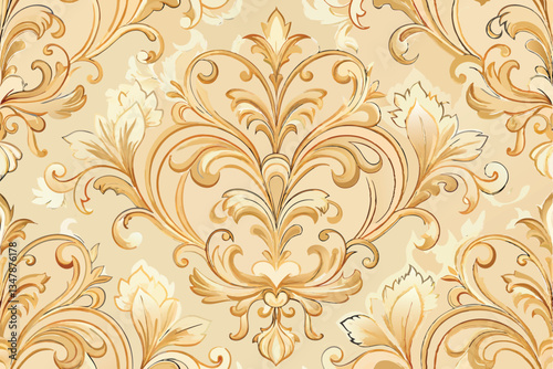 Intricate baroque floral wallpaper texture with an ornate design, featuring detailed swirling elements in gold and beige tones for elegant decor