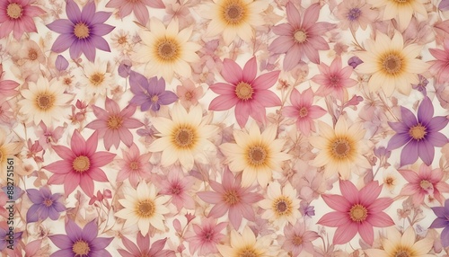 Intricate botanical pattern featuring a diverse array of flowers in shades of pink, purple, and yellow on a pure white surface