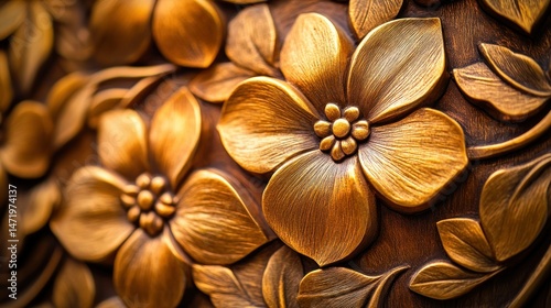 Intricate floral relief carving on a wooden surface. Detailed golden flower patterns in high relief
