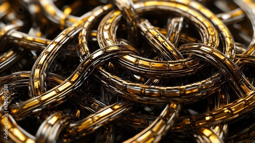 abstract, futuristic, technology, gold, metal, loop, intricate, design, texture, pattern, modern, geometric, shape, circle, line, three-dimensional, rendering, art, graphic, visual, composition, illustration, gold, dark, black, chrome, shiny, complex, intertwined, connection, system, structure, network, patterned, cable, wiring, complexion, designing, contemporary, creative, metallic