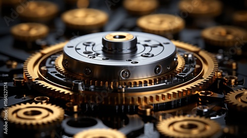 gear, machine, mechanism, technology, engineering, precision, metal, gold, silver, component, industrial, design, clockwork, cog, wheel, interlocking, complex, intricate, detailed, closeup, macro, texture, pattern, movement, motion, system, hardware, manufacturing, craftsmanship, craftsmanship, aesthetic, art, luxury, sophistication, elegant, refined, polished, shiny, dark, background