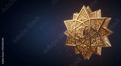 Intricate golden islamic geometric star design floating on a dark blue background