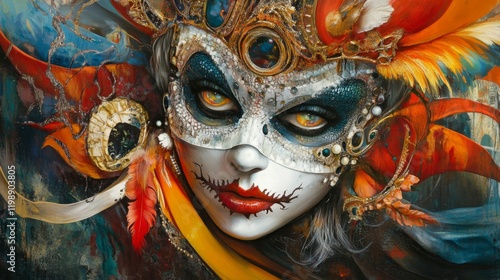 mask, venetian, carnival, costume, halloween, fantasy, whimsical, portrait, face, eye, colourful, vibrant, intricate, detailed, art, painting, digital, illustration, design, graphic, texture, pattern, festive, celebration, mysterious, enigmatic, dramatic, expression, emotion, creepy, gothic, grisly, dark, shadow, light, contrast, red, orange, yellow, blue, gold, white, black, feather, jewellery, ornament
