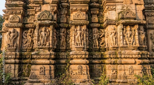 Intricately carved ancient temple wall with Hindu deities and mythological scenes