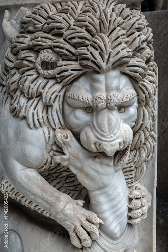 Intricately Carved Marble Lion Sculpture Gripping Human Figure Showing Detailed Mane and Expressive Face in Classical Stone Artwork in Rome, Italy